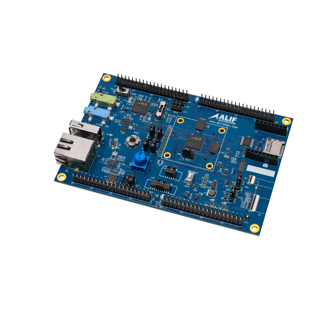 The Ensemble E8 DevKit (DK-E8) is a cost-effective, single-board solution that brings out all signals on the device to easily access pins for power and performance profiling, prototyping, and more. The DevKit can be configured to operate as your choice of the E4, E6, or E8 series MCU devices in the Ensemble family, with superset E8 series device having two Cortex-M55 CPU cores, two Ethos-U55 + one Ethos-U85 neural network processors cores, and two Cortex-A32 MPU cores.