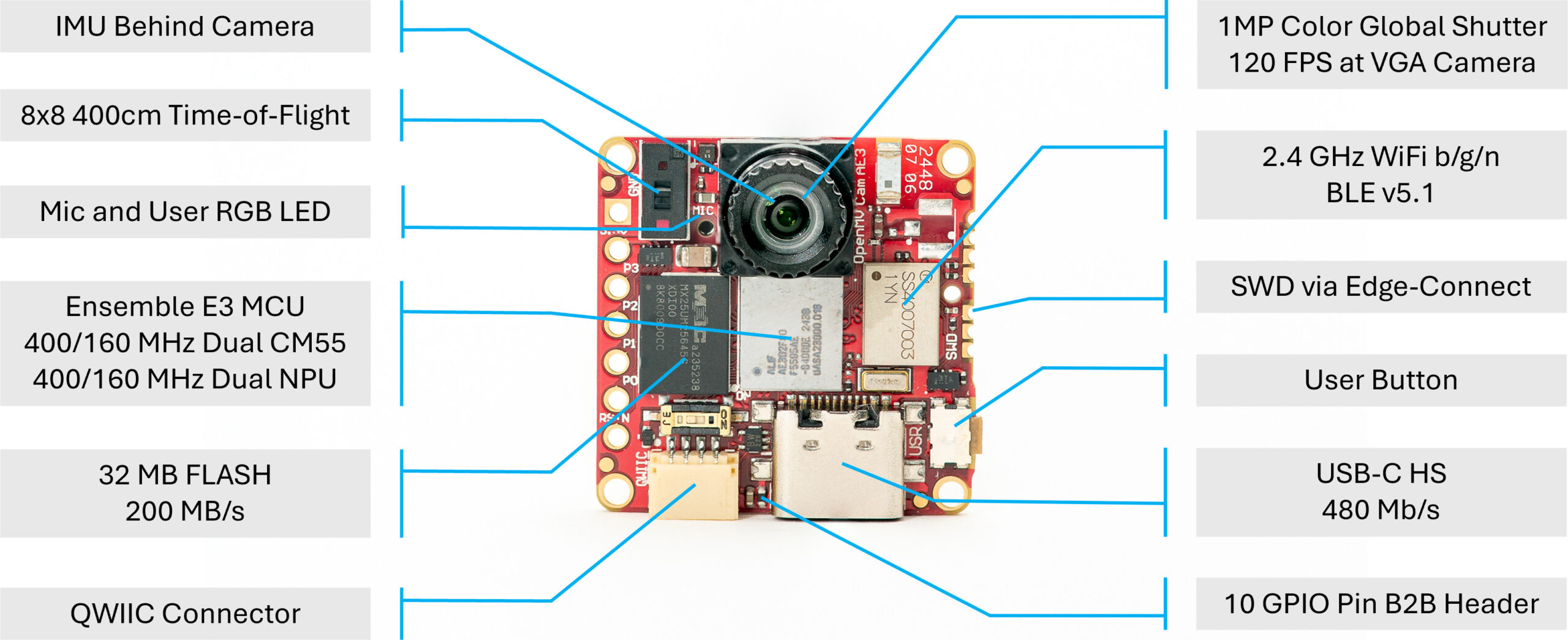 This reflects a core philosophy of Alif which underlies its development of the Ensemble and Balletto products: that an MCU’s performance is not determined by the headline CPU clock speed – the whole data processing system, including memory and the data pipeline, affects real-world data throughput. And this is why the Ensemble E3 chosen by OpenMV has so much fast memory on-chip.