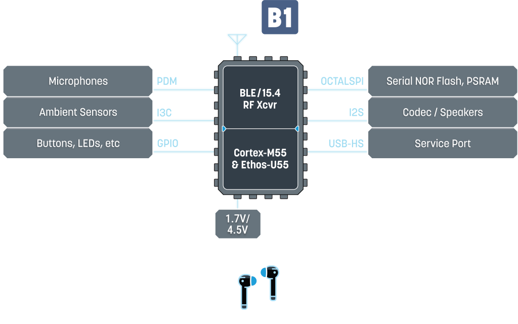 Alif’s Balletto™ family of MCUs are purpose-built to address the unique challenges of hearables like TWS earbuds and hearing aids. Balletto MCUs deliver an unprecedented combination of powerful processing, wireless connectivity, hardware-accelerated AI/ML, ultra-low power consumption, and miniature chip-scale packaging.