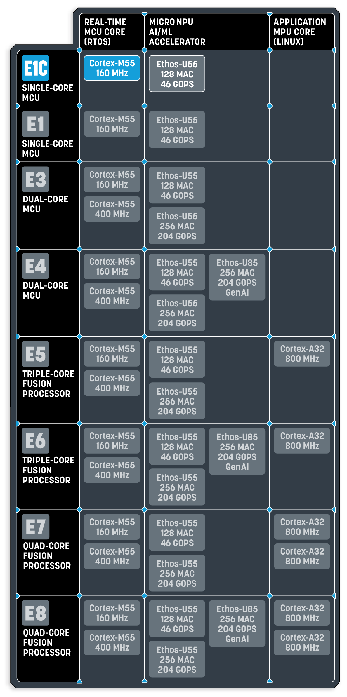 - 1× Arm Ethos™-U55 Neural Processing Unit— 128 MAC/cycle up to 46 GOPS, On-the-Fly Weight Decompression with Dedicated DMA Controller