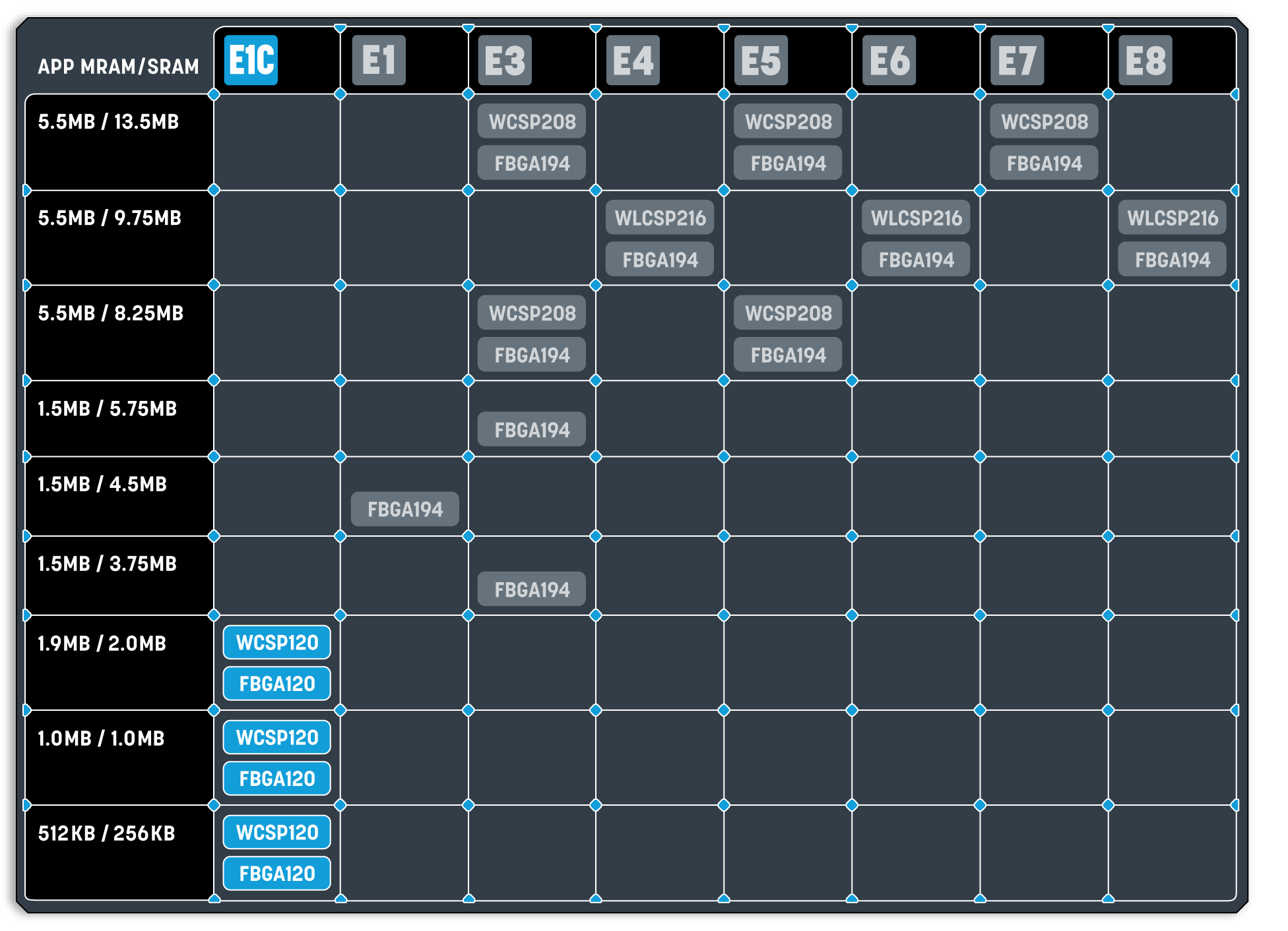 - Up to 2MB Zero Wait-State with Optional Retention in Increments of 64KB (450 nA), 128KB (900 nA), 256KB (1.8 μA), 512KB (3.6μA), 1MB (7.2 μA), 2MB (14.4 μA) at 3.3V