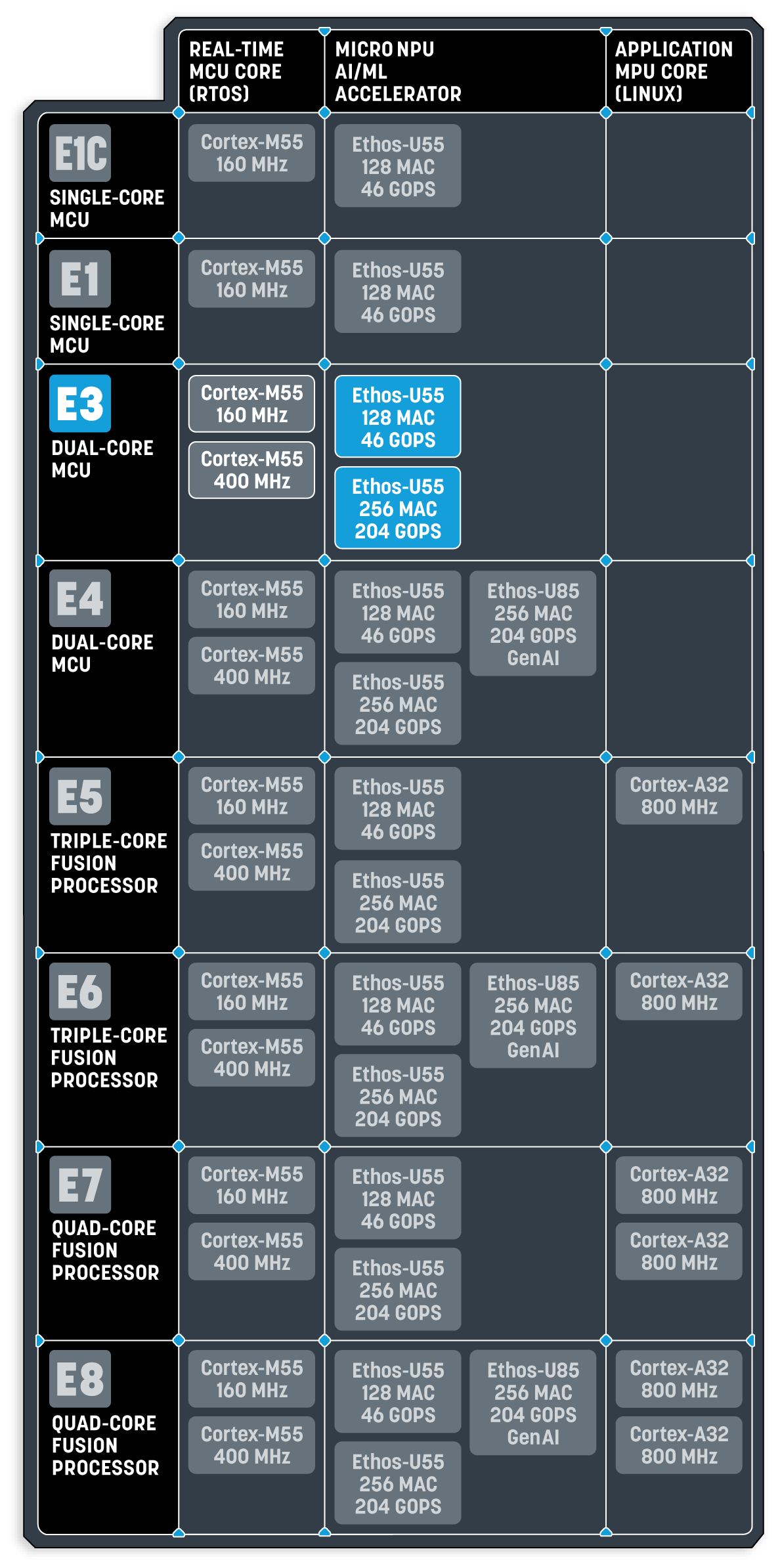 The Ensemble E3 series of microcontroller is designed for applications demanding a combination of maximum power efficiency, high compute performance, and integrated security. It’s innovative multi-code design provides a dedicated system for power efficient operations, while the second core is ready to deliver high-performance processing when needed. Both cores can also be outfitted with dedicated NPU accelerators to boost Edge AI/ML capabilities and can operate independent of each other, enabling parallel model execution.